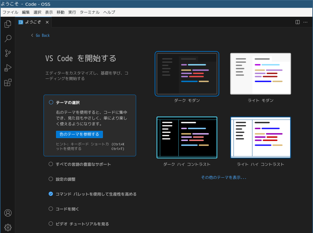 日本語化後、再起動直後の状態です。 2024年12月19日の時点で、下記のバージョンでした。 「Visual Studio Code」の操作等については「統合開発環境 Visual Studio Code」をご参照ください。 |