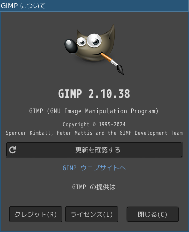 起動直後の状態です。 2025年5月16日の時点で、下記のバージョンでした。 操作については、「画像編集ソフト GIMP2」に掲載しています。 上記は簡単なものですので、詳細なものがほしい方は、各所に初歩の手引きから応用編までありますので、そちらを参考にしてください。 |