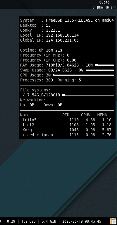 ログインしなおすと、デスクトップ右に、「Conky」の表示が現れます。