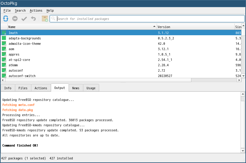 1. 概要 「OctoPkg」は、パッケージ管理(pkg)のグラフィカルフロントエンドです。 基本的な操作については共通事項の「パッケージ管理 OctoPkg」を参照してください。 2. インストール 「root」ユーザ権限で。 pkg install -y octopkg 3. 起動 「スタート」→「システム」→「OctoPkg」