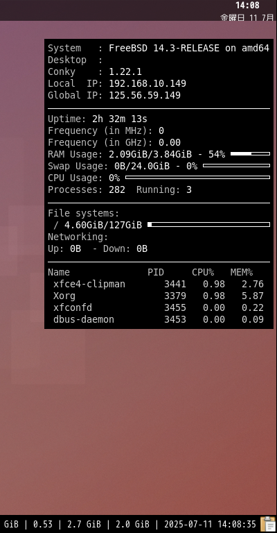 i3wm - FreeBSD 14.3 RELEASE - タスクマネージャ Conky