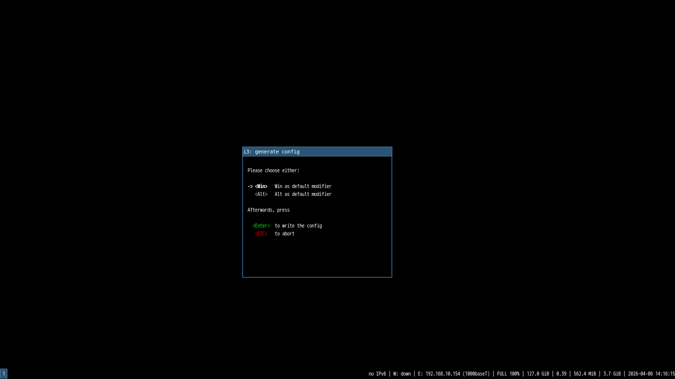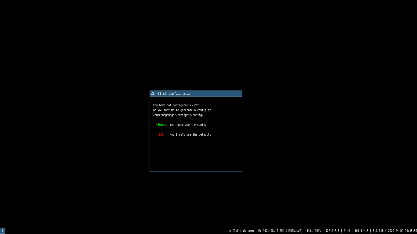 が存在しないため、初回ログイン時に「i3-config-wizard」が起動します。