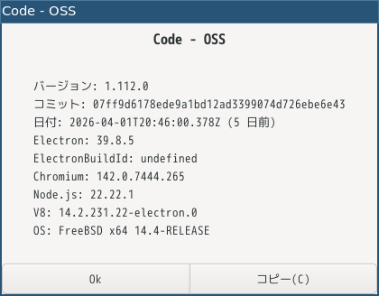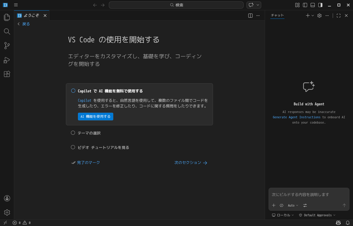 日本語化後、再起動直後の状態です。 2026年4月7日の時点で、下記のバージョンでした。 「Visual Studio Code」の操作等については「統合開発環境 Visual Studio Code」をご参照ください。 |