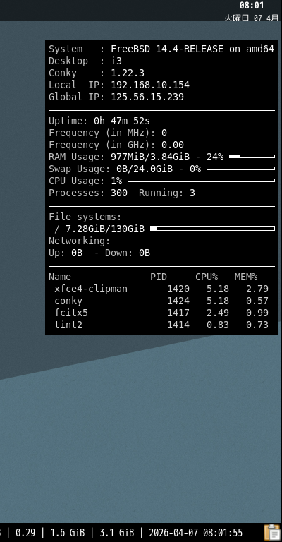 ログインしなおすと、デスクトップ右に、「Conky」の表示が現れます。