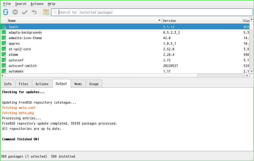 1. 概要 「OctoPkg」は、「pkg」コマンドのフロントエンドです。 2. インストール 「OctoPkg」自体は、コマンドでインストールします。 「root」ユーザ権限で。 pkg install -y octopkg 3. 起動 「スタート」→「システム」→「OctoPkg」