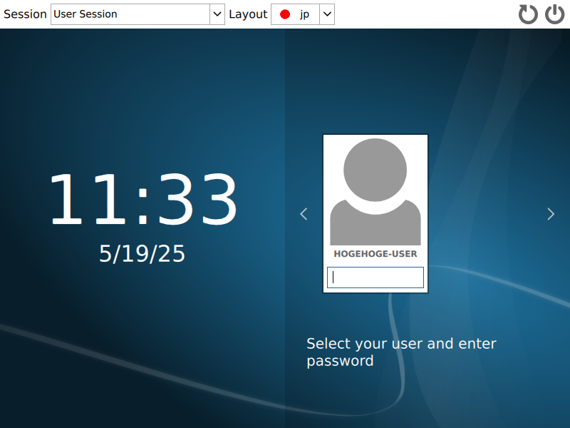 ログイン画面の解像度を「1366x768」とし、キーボードレイアウトを「jp.106」にします。