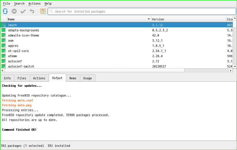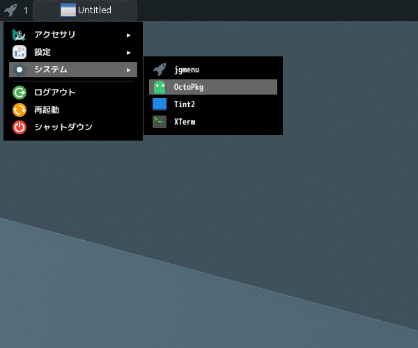 1. 概要 「OctoPkg」は、「pkg」コマンドのフロントエンドです。 2. インストール 「OctoPkg」自体は、コマンドでインストールします。 「root」ユーザ権限で。 pkg install -y octopkg 3. 起動 「スタート」→「システム」→「OctoPkg」