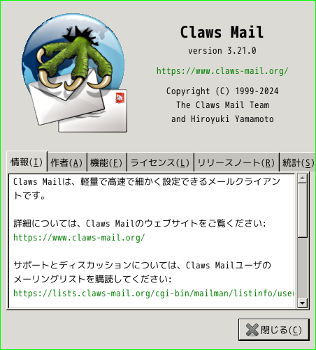 1. 概要 メールクライアントとして、「Claws Mail」を使用します。 2. インストール 「OctoPkg」で、「claws-mail」を検索して、 インストールします。 3. 起動 「スタート」→「インターネット」→「Claws Mail」