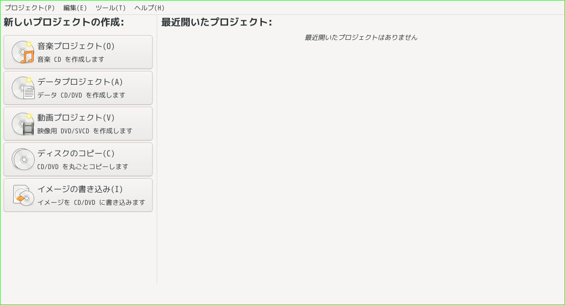 1. 概要 光ディスク(CD・DVD)のライティングソフトとして、「Brasero」を使用します。 2. インストール 「OctoPkg」で、「brasero」を検索して、インストールします。 3. 起動 「スタート」→「マルチメディア」→「Brasero」 これで起動できないことがあります、そういうときは、ログインしなおすことで、起動できるようになります。