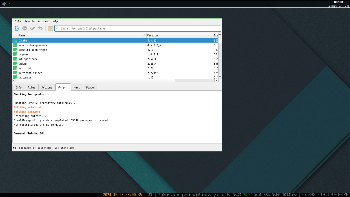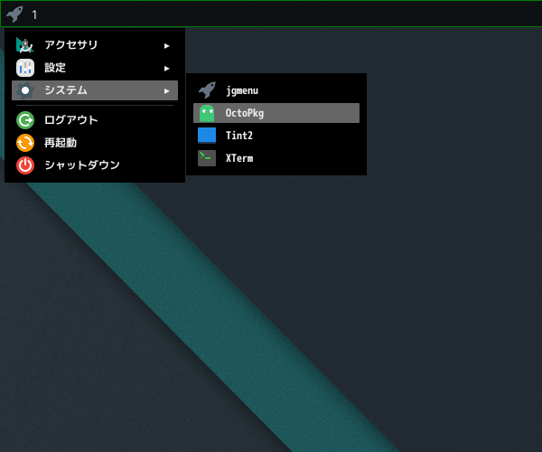 1. 概要 「OctoPkg」は、「pkg」コマンドのフロントエンドです。 2. インストール 「OctoPkg」自体は、コマンドでインストールします。 「root」ユーザ権限で。 pkg install -y octopkg 3. 起動 「スタート」→「システム」→「OctoPkg」