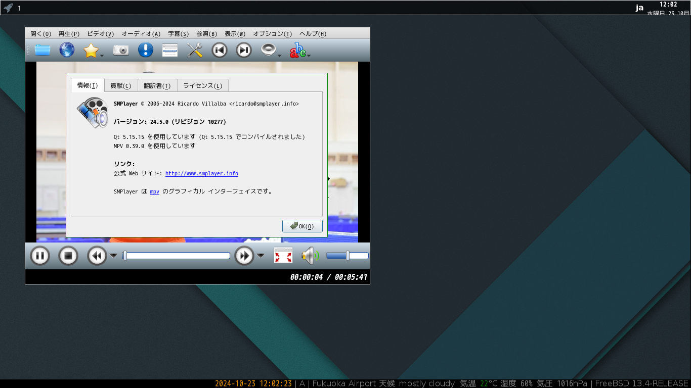 起動直後の状態です。 ビデオコンテンツを再生してみました。 快適に再生できます。 2024年10月23日の時点で、下記のバージョンでした。 |
