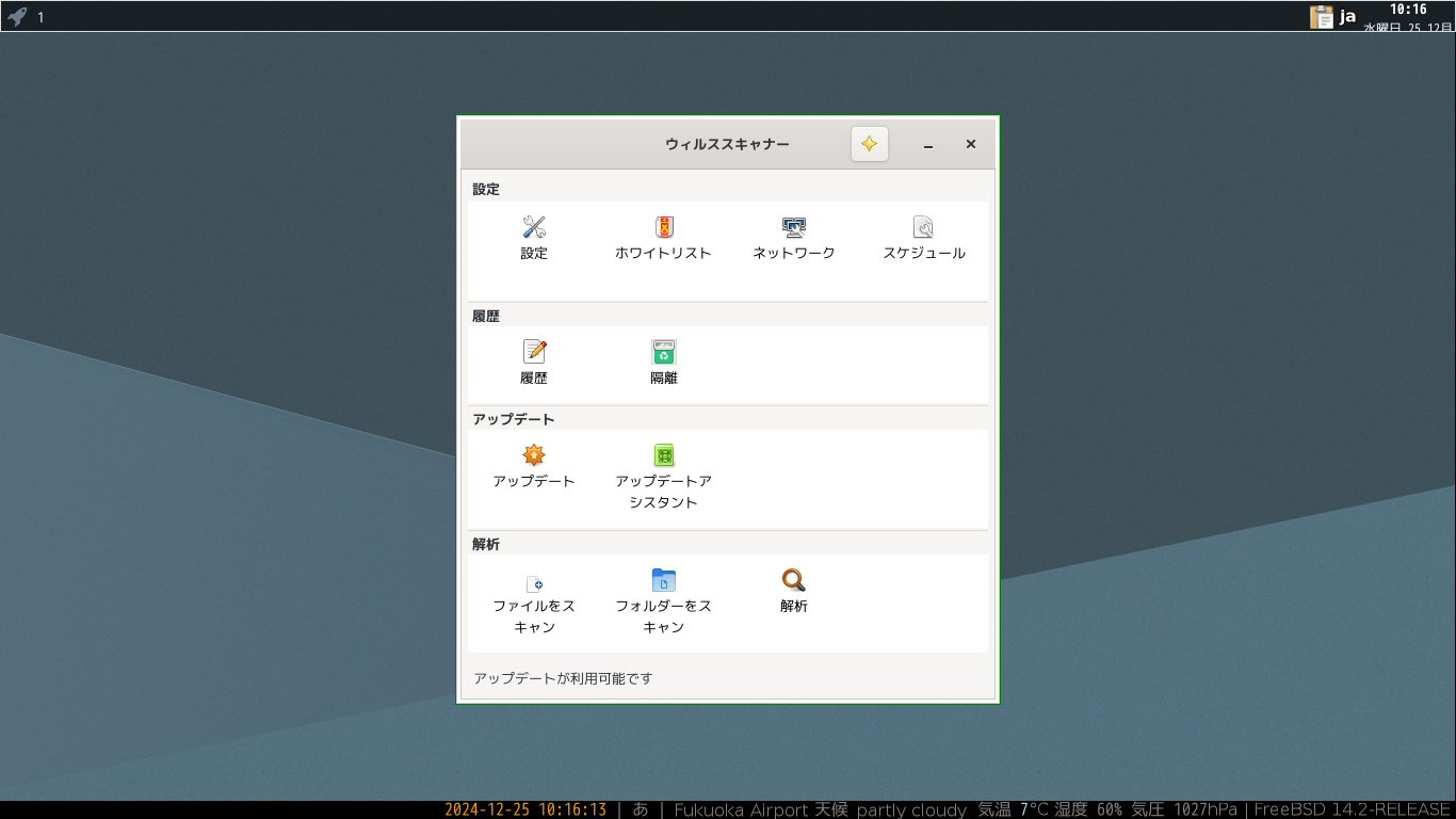 操作方法等に関しては、「デスクトップ環境構築 - 共通事項 - アンチウイルスソフト ClamTk」をご参照ください。