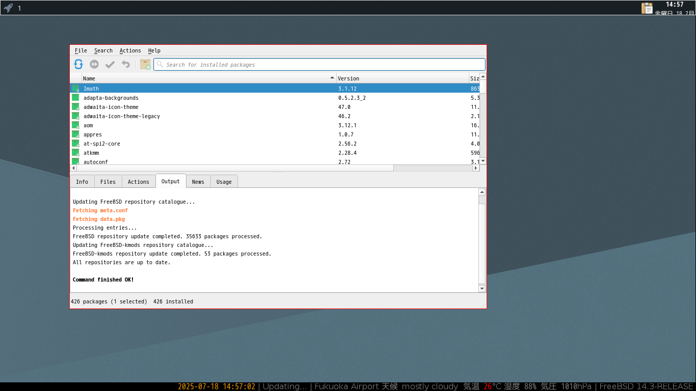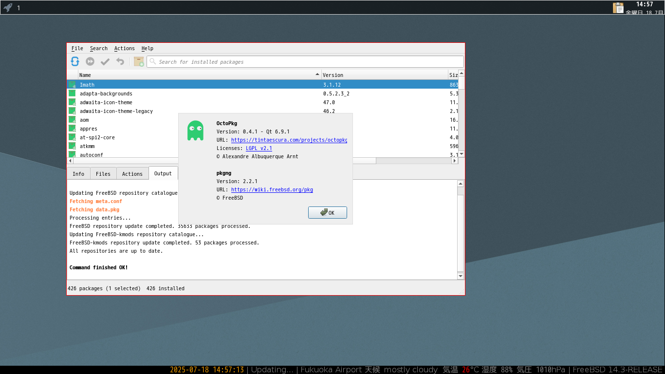 1. 概要 「OctoPkg」は、「pkg」コマンドのフロントエンドです。 2. インストール 「OctoPkg」自体は、コマンドでインストールします。 「root」ユーザ権限で。 pkg install -y octopkg 3. 起動 「スタート」→「システム」→「OctoPkg」