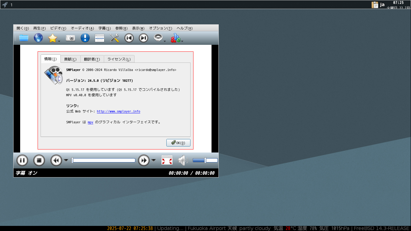 1. 概要 メディアプレイヤーとして、「SMPlayer」を使用します。 2. インストール 「OctoPkg」で、「smplayer」を検索して、インストールします。 3. 起動 「スタート」→「マルチメディア」→「SMPlayer」