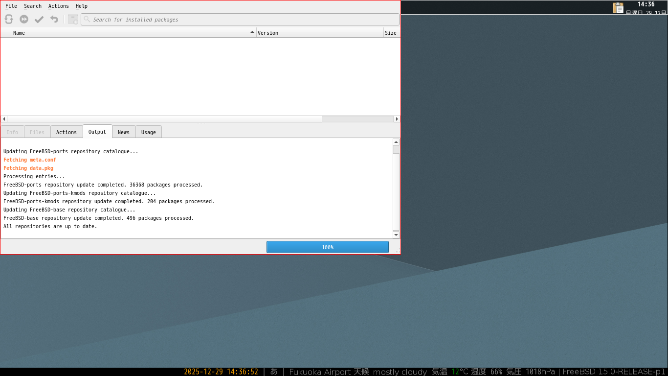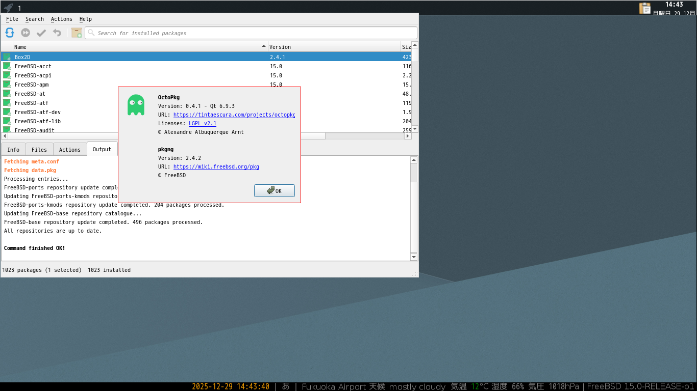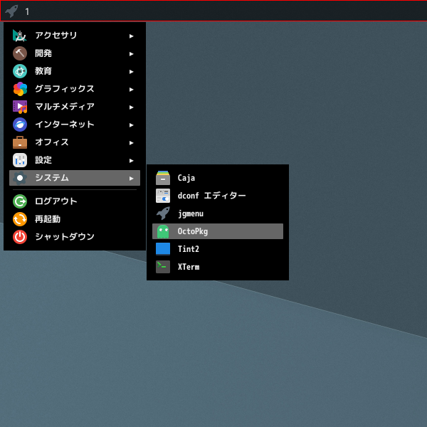 1. 概要 「OctoPkg」は、「pkg」コマンドのフロントエンドです。 2. インストール 「OctoPkg」自体は、コマンドでインストールします。 「root」ユーザ権限で。 pkg install -y octopkg 3. 起動 「スタート」→「システム」→「OctoPkg」