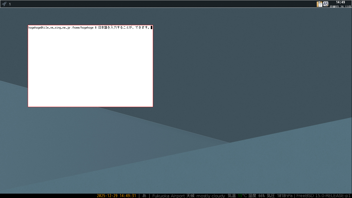 入力メソッドの状態を「xmobar」に表示させていますが、「tint2」に表示されているので、「xmobar」の表示はなくてもいいかもしれません。