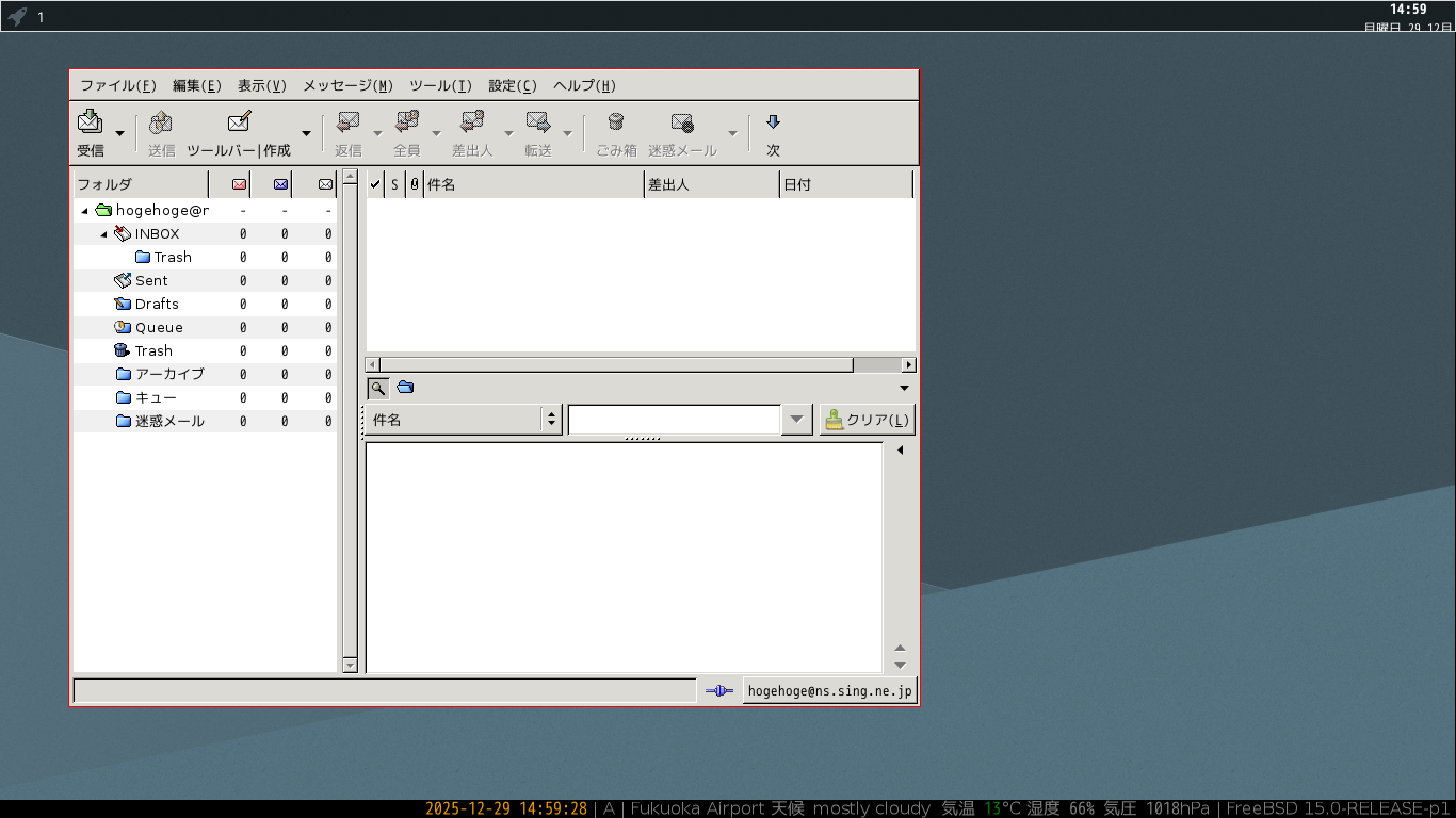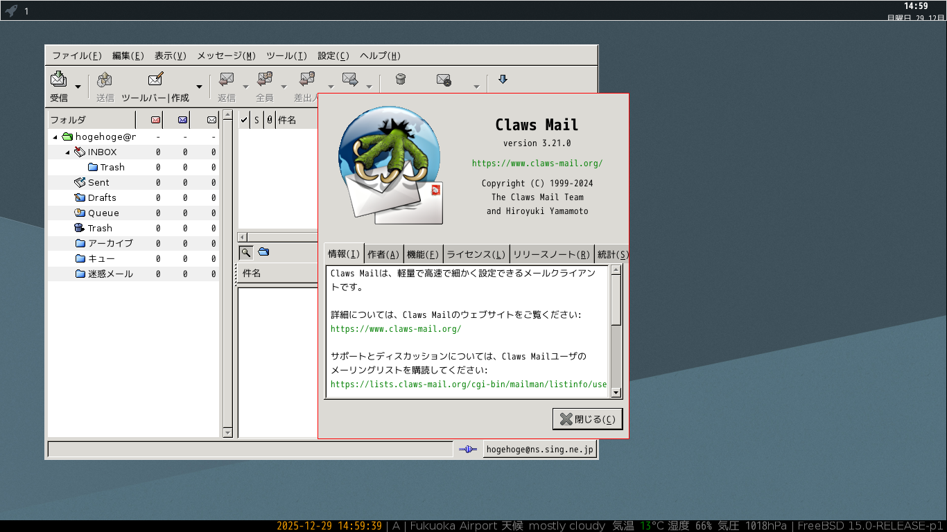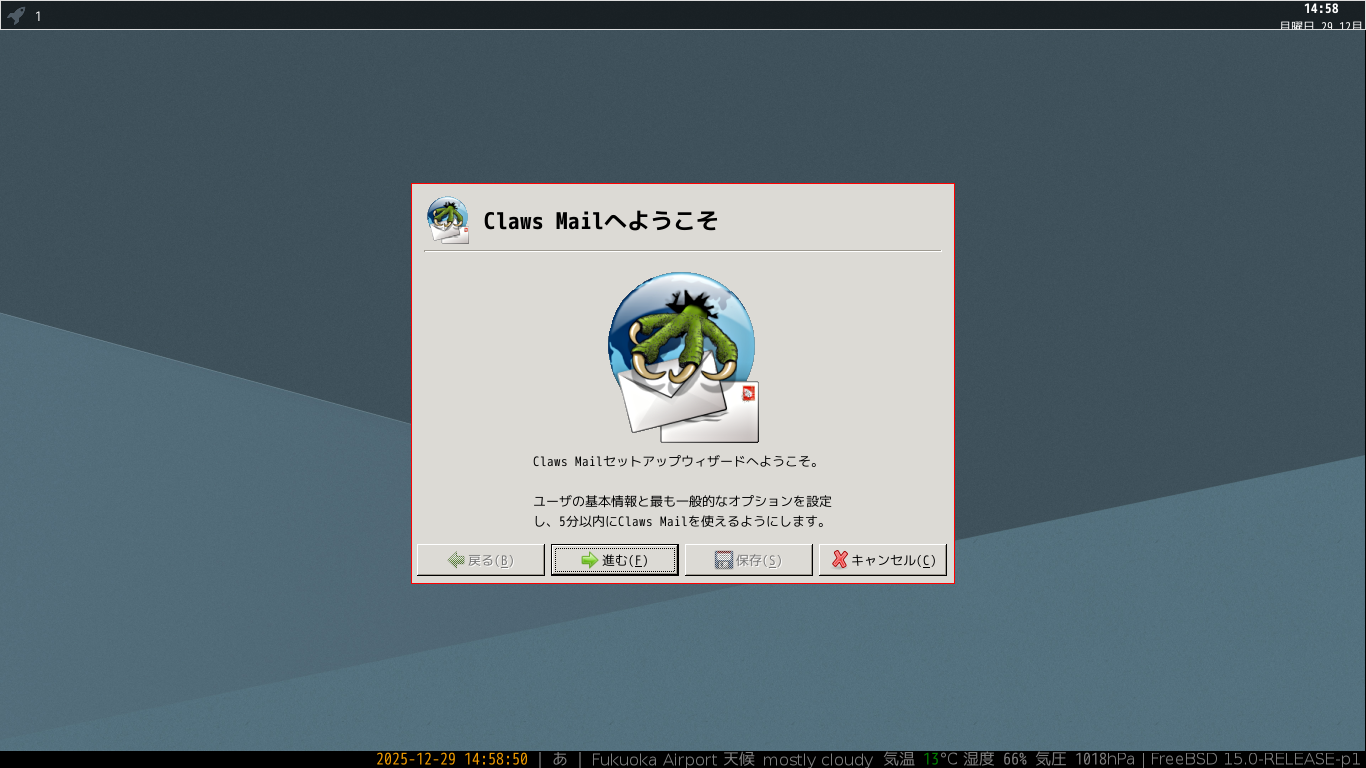 1. 概要 メールクライアントとして、「Claws Mail」を使用します。 2. インストール 「OctoPkg」で、「claws-mail」を検索して、インストールします。 3. 起動 「スタート」→「インターネット」→「Claws Mail」