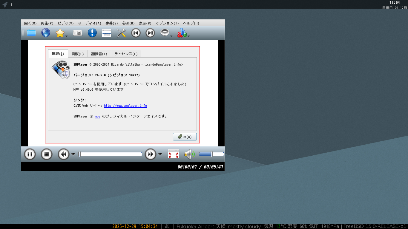 1. 概要 メディアプレイヤーとして、「SMPlayer」を使用します。 2. インストール 「OctoPkg」で、「smplayer」を検索して、インストールします。 3. 起動 「スタート」→「マルチメディア」→「SMPlayer」