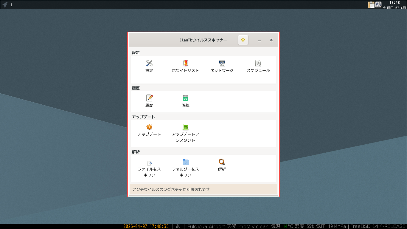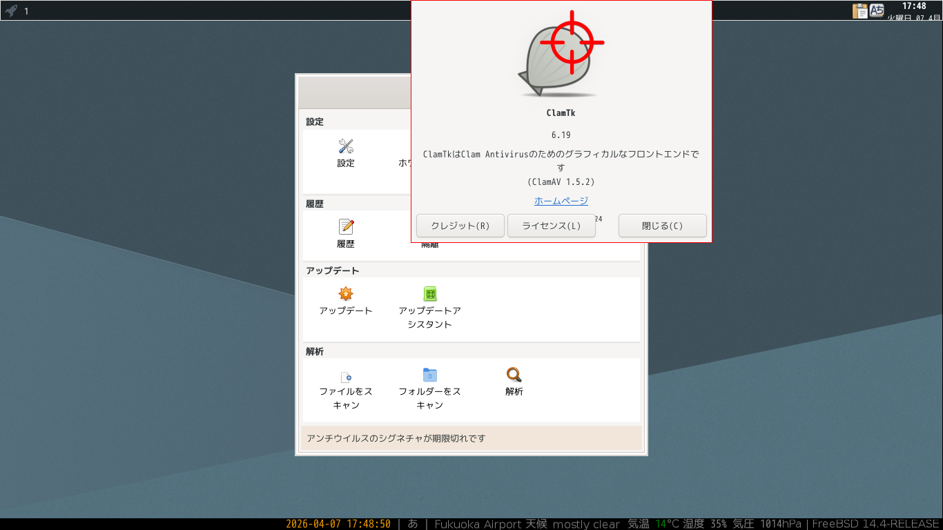 操作方法等に関しては、「デスクトップ環境構築 - 共通事項 - アンチウイルスソフト ClamTk」をご参照ください。