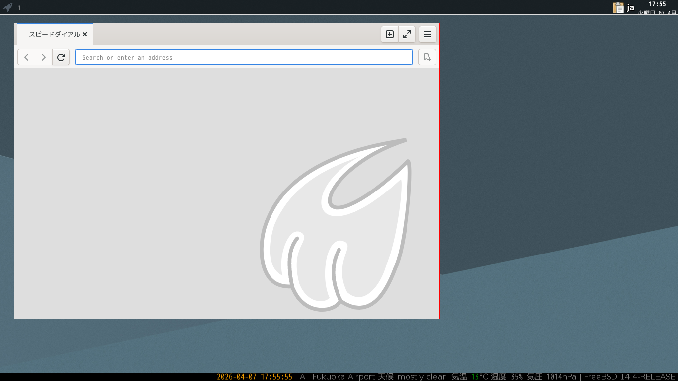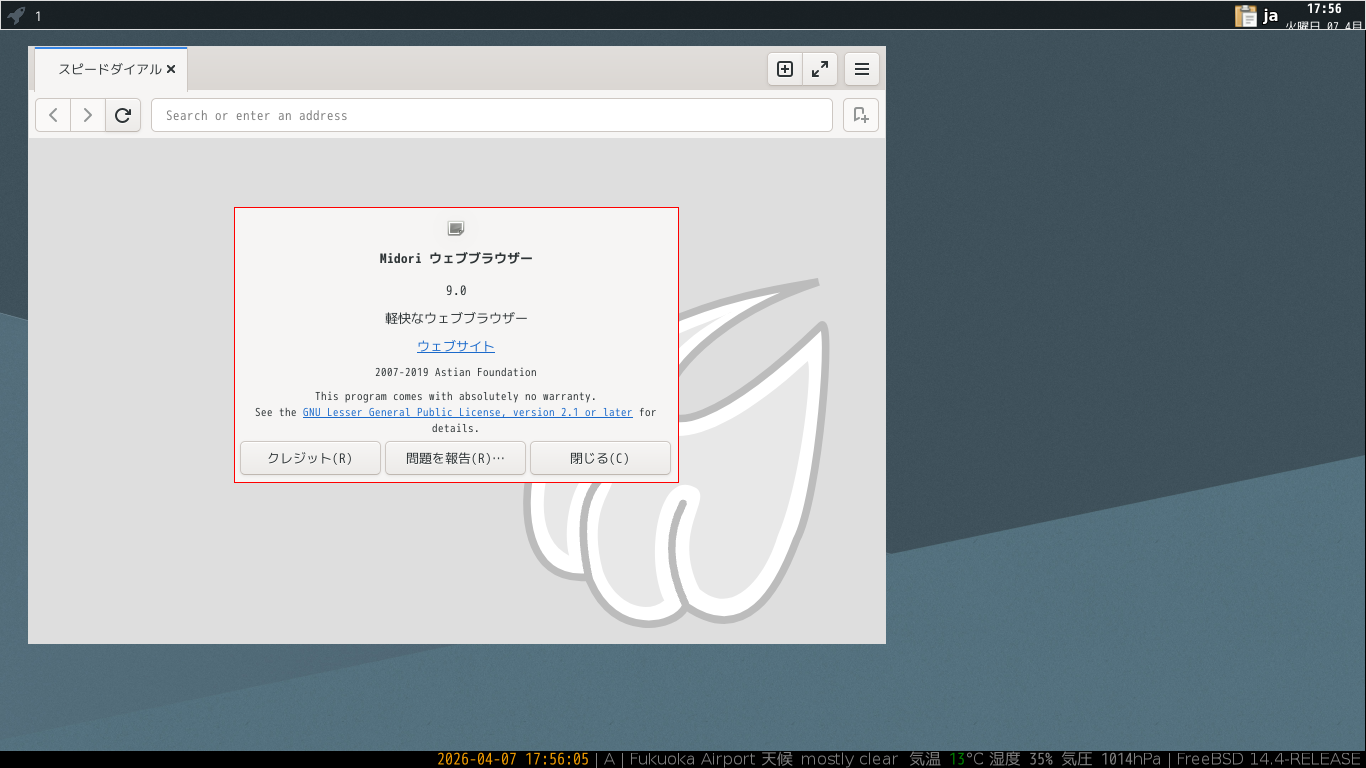 1. 概要 ブラウザとして、軽いので、「Midori」を使用します。 2. インストール 「root」ユーザ権限で。 pkg install -y midori 3. 起動 「スタート」→「インターネット」→「Midori」