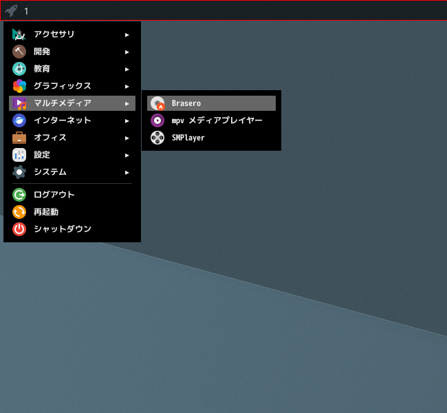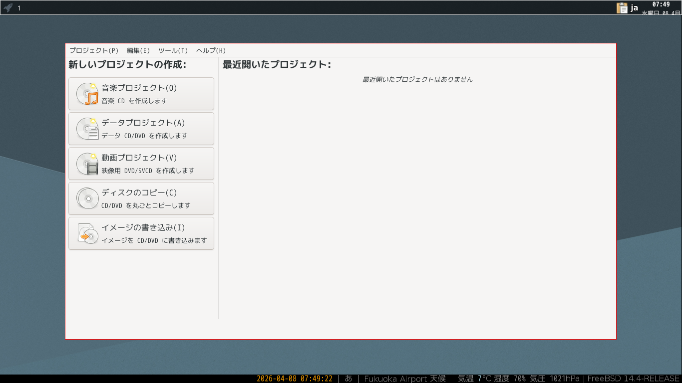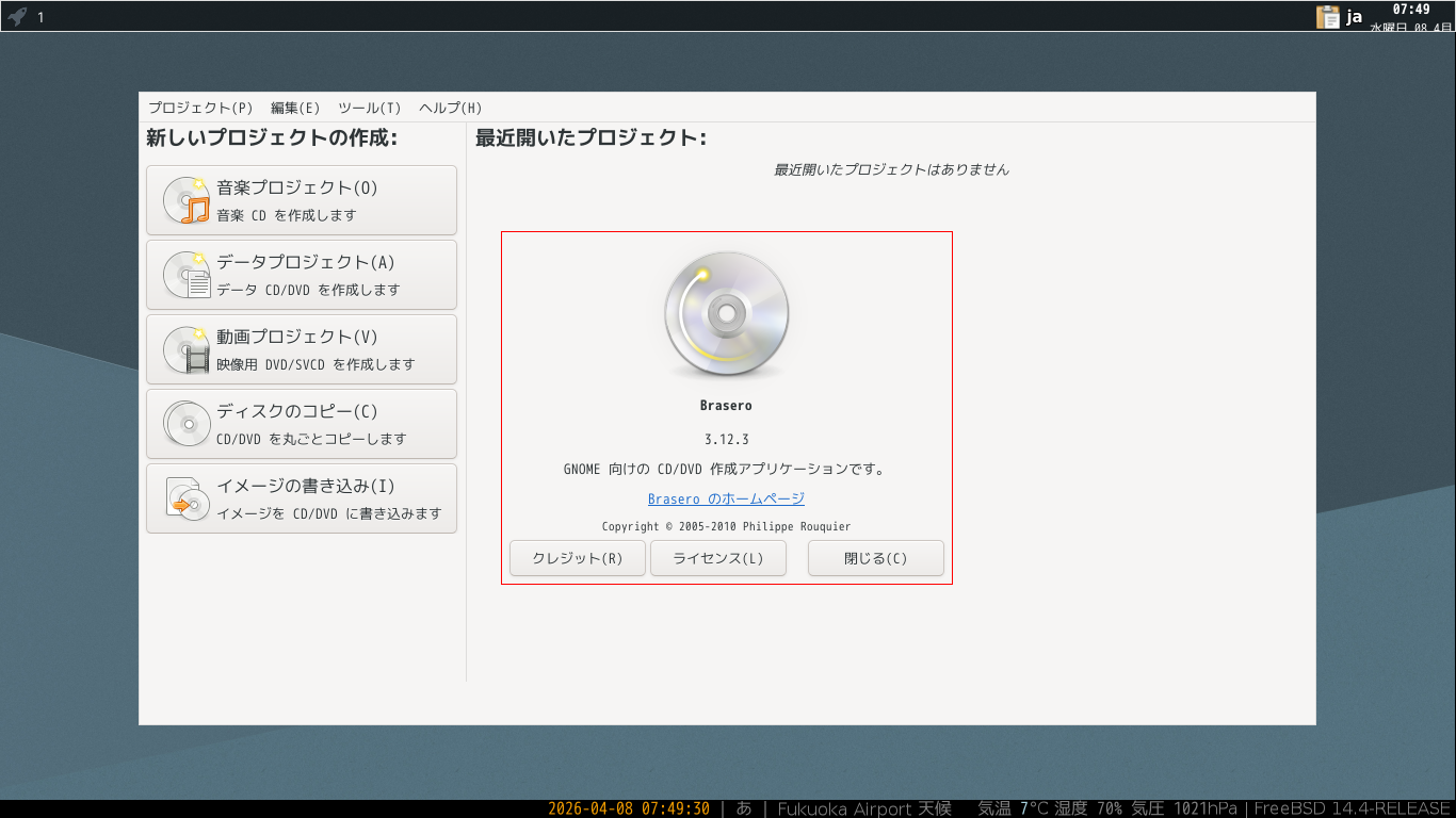 1. 概要 光ディスク(CD・DVD)のライティングソフトとして、「Brasero」を使用します。 2. インストール 「root」ユーザ権限で。 pkg install -y brasero インストール直後は、起動できないことがあります。 インストール後に一度、ログインしなおします。 3. 起動 「スタート」→「マルチメディア」→「Brasero」