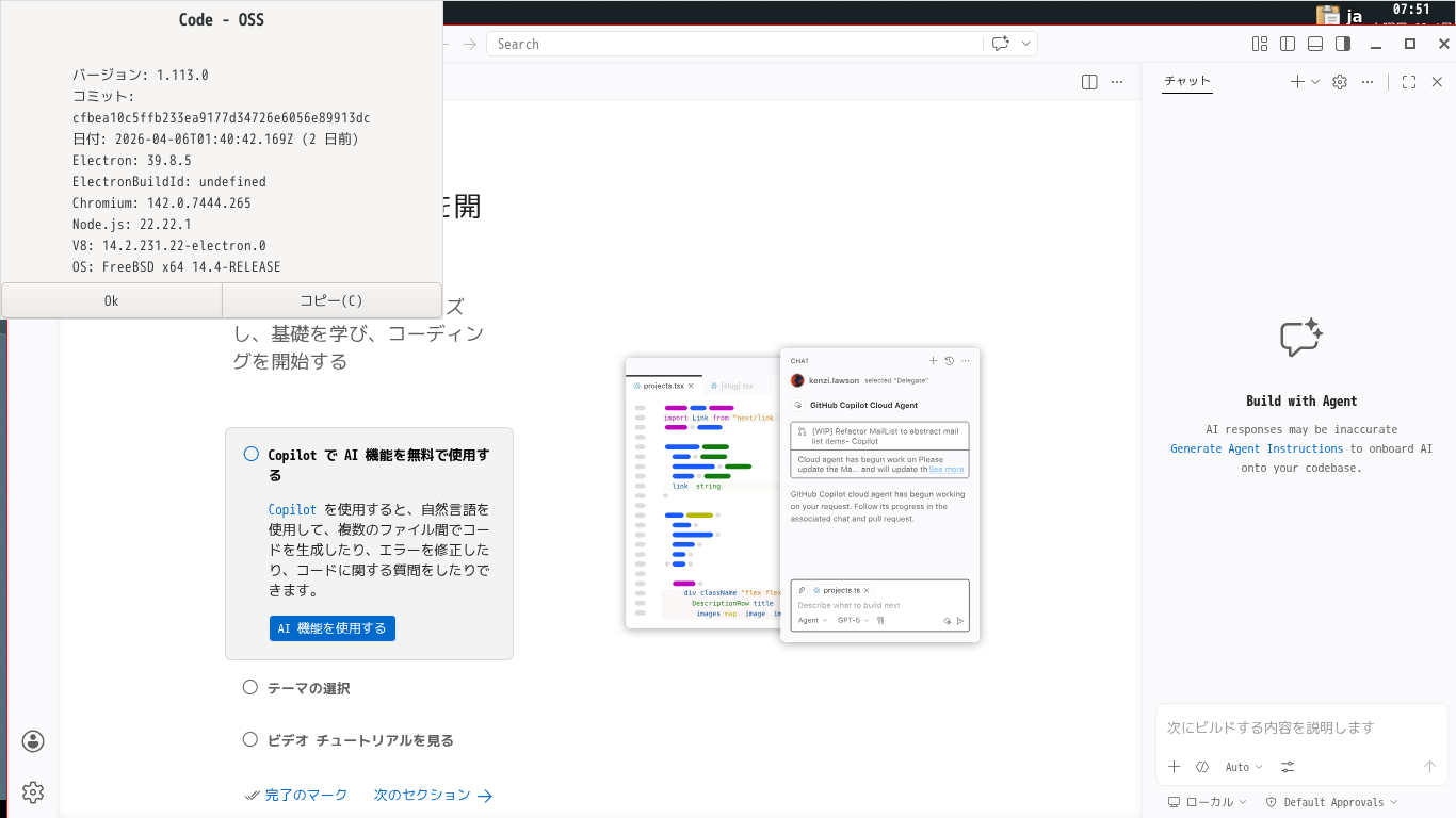 1. 概要 開発環境として、「Visual Studio Code」を使用します。 2. インストール 「root」ユーザ権限で。 pkg install -y vscode 3. 起動 「スタート」→「開発」→「Code - OSS」