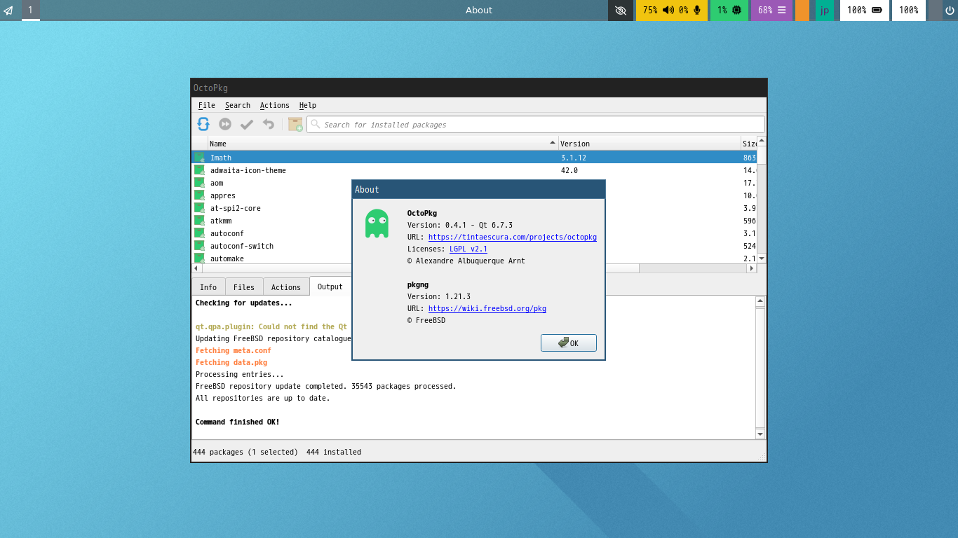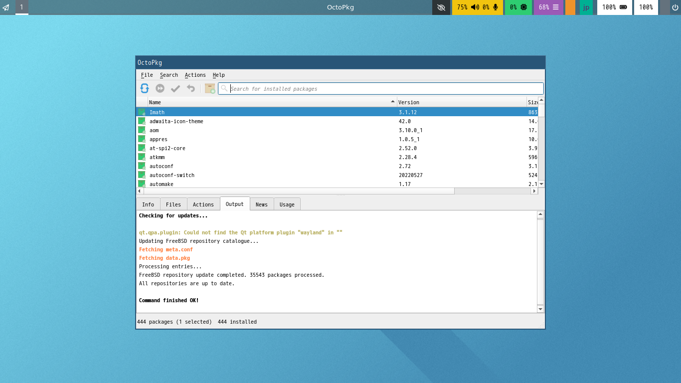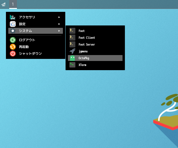 1. 概要 「OctoPkg」は、パッケージ管理(pkg)のグラフィカルフロントエンドです。 基本的な操作については共通事項の「パッケージ管理 OctoPkg」を参照してください。 2. インストール 「OctoPkg」自体は、コマンドでインストールします。 「root」ユーザ権限で。 pkg install -y octopkg 3. 起動 「スタート」→「システム」→「OctoPkg」