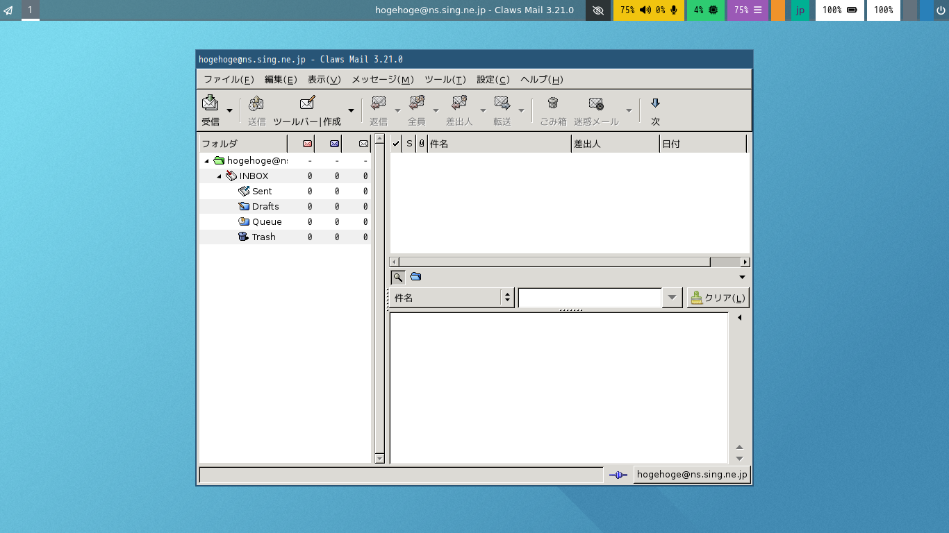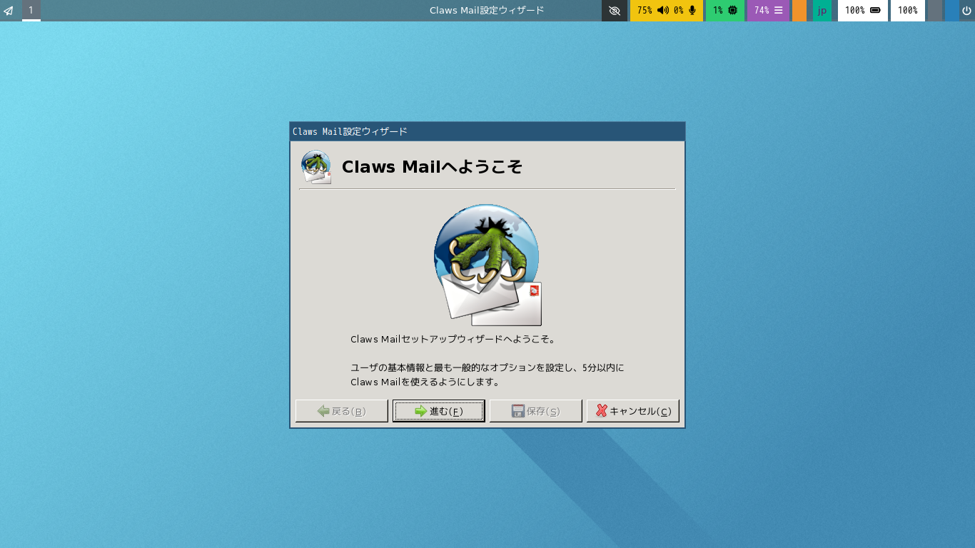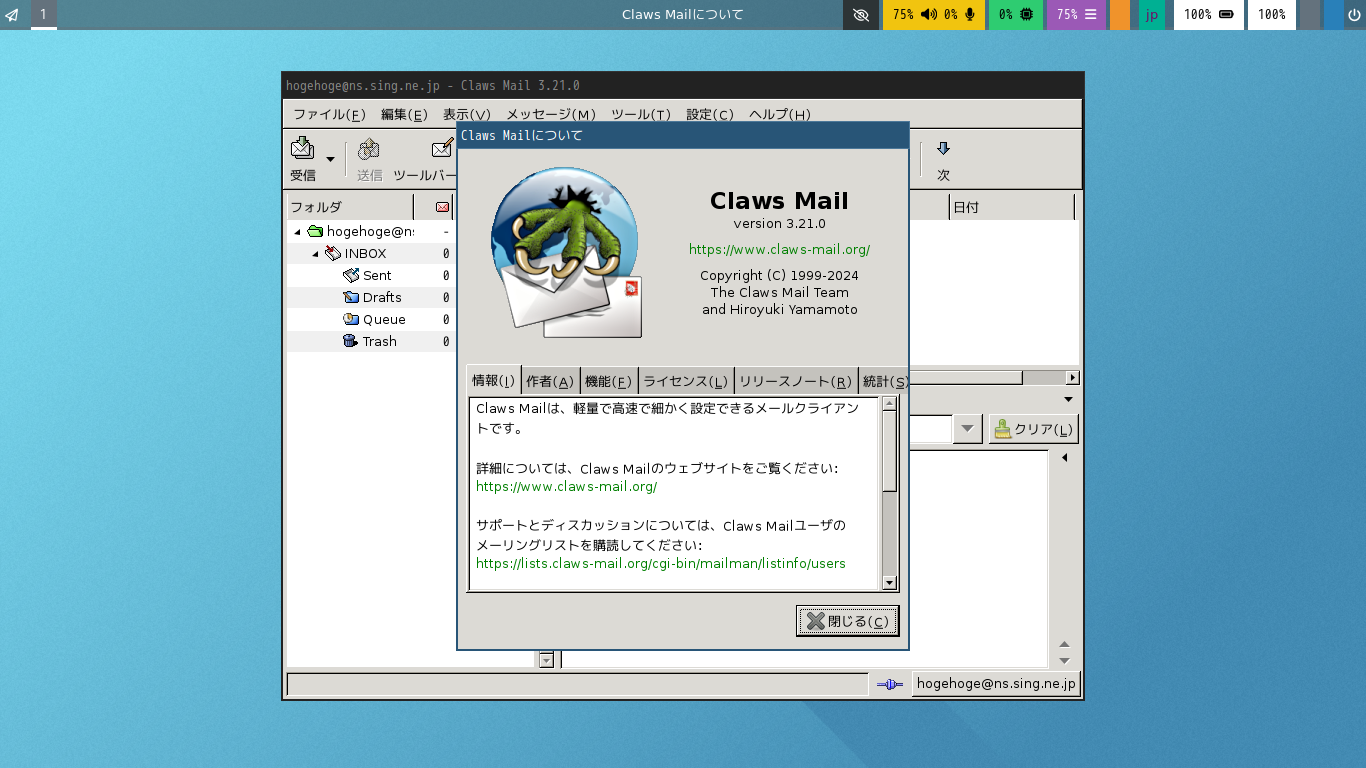 初回起動時は「設定ウィザード」から始まります。 起動直後の状態です。 2024年10月24日の時点で、下記のバージョンでした。 「設定ウィザード」他、操作方法については、「メールクライアント - Claws Mail」をご参照ください。 |