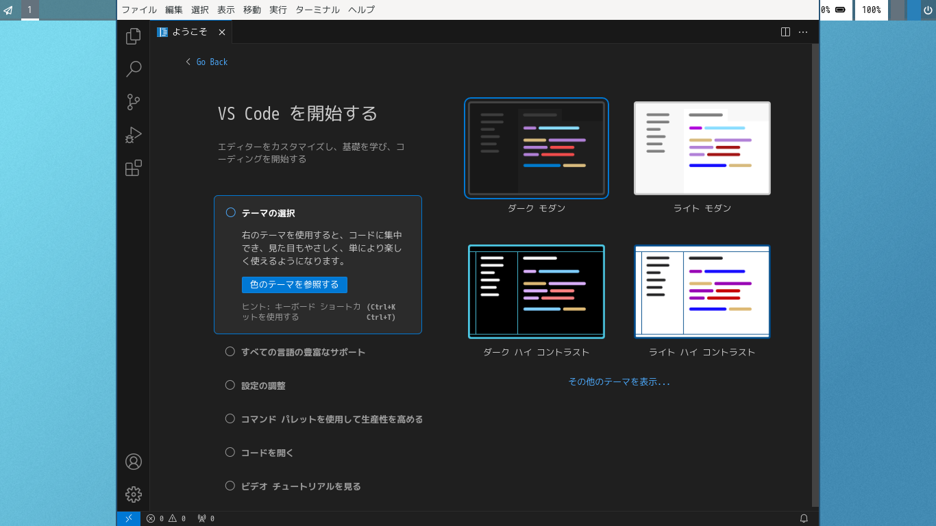 日本語化後、再起動直後の状態です。 2024年10月24日の時点で、下記のバージョンでした。 「Visual Studio Code」の操作等については「統合開発環境 Visual Studio Code」をご参照ください。 |