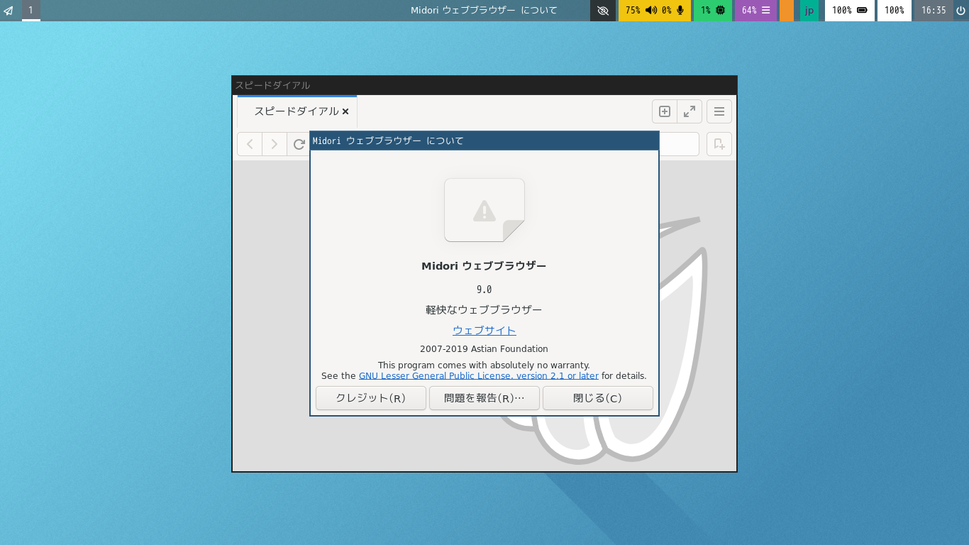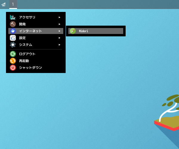 1. 概要 ブラウザとして、「Midori」を使用します。 2. インストール 「OctoPkg」で、「midori」を検索して、インストールします。 3. 起動 「スタート」→「インターネット」→「Midori」