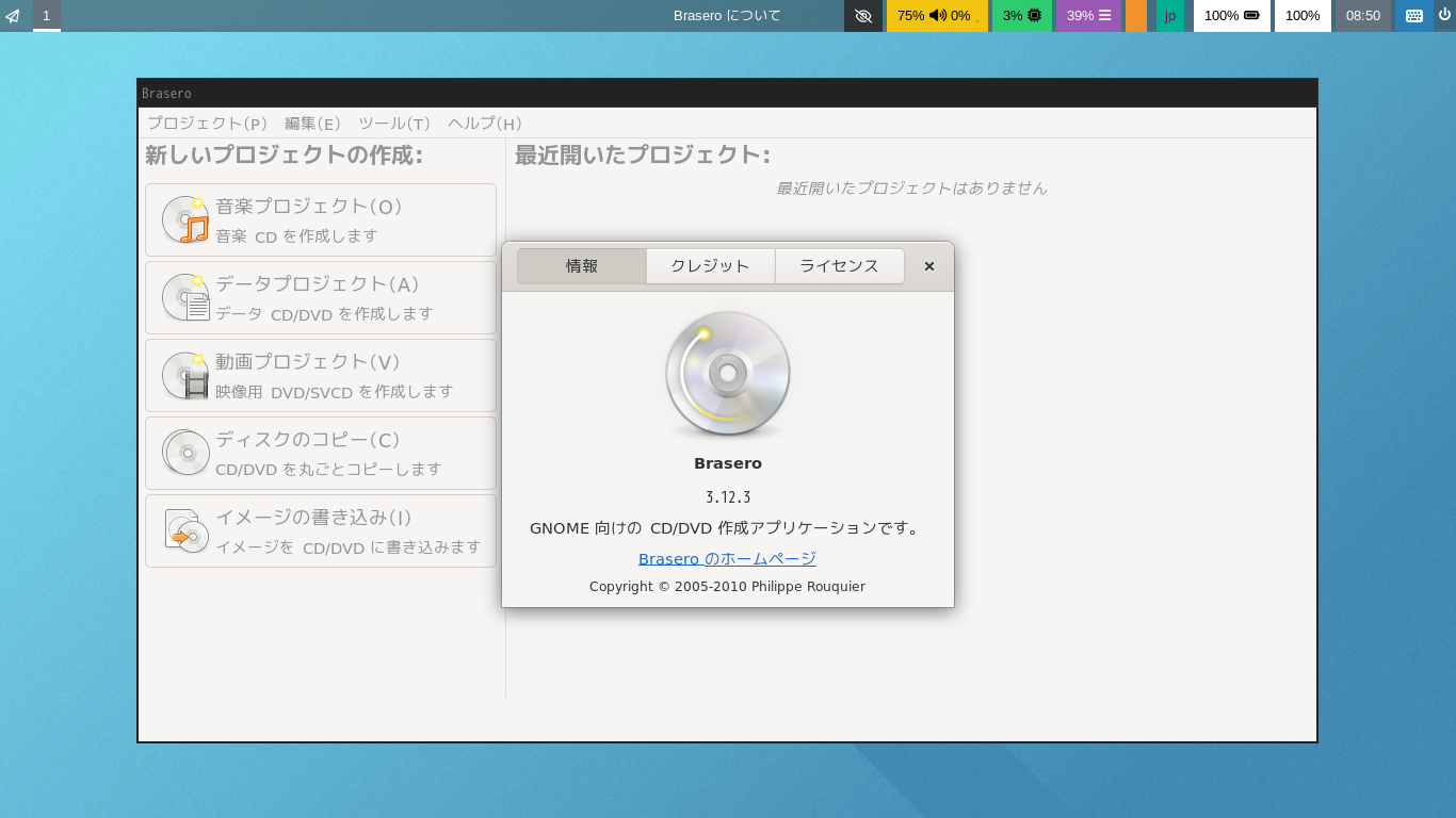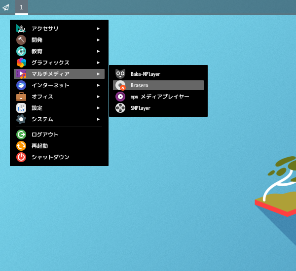 1. 概要 「Brasero」は、光学ディスク(CD・DVD)のライティングソフトです。 基本的な操作については「共通事項 - 光ディスクライティング」をご参照ください。 2. インストール 「OctoPkg」で、「brasero」を検索して、インストールします。 3. 起動 「スタート」→「マルチメディア」→「Brasero」