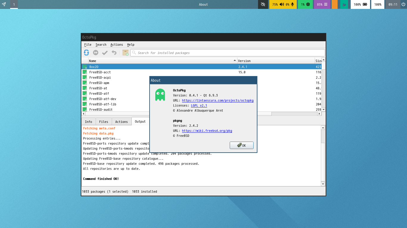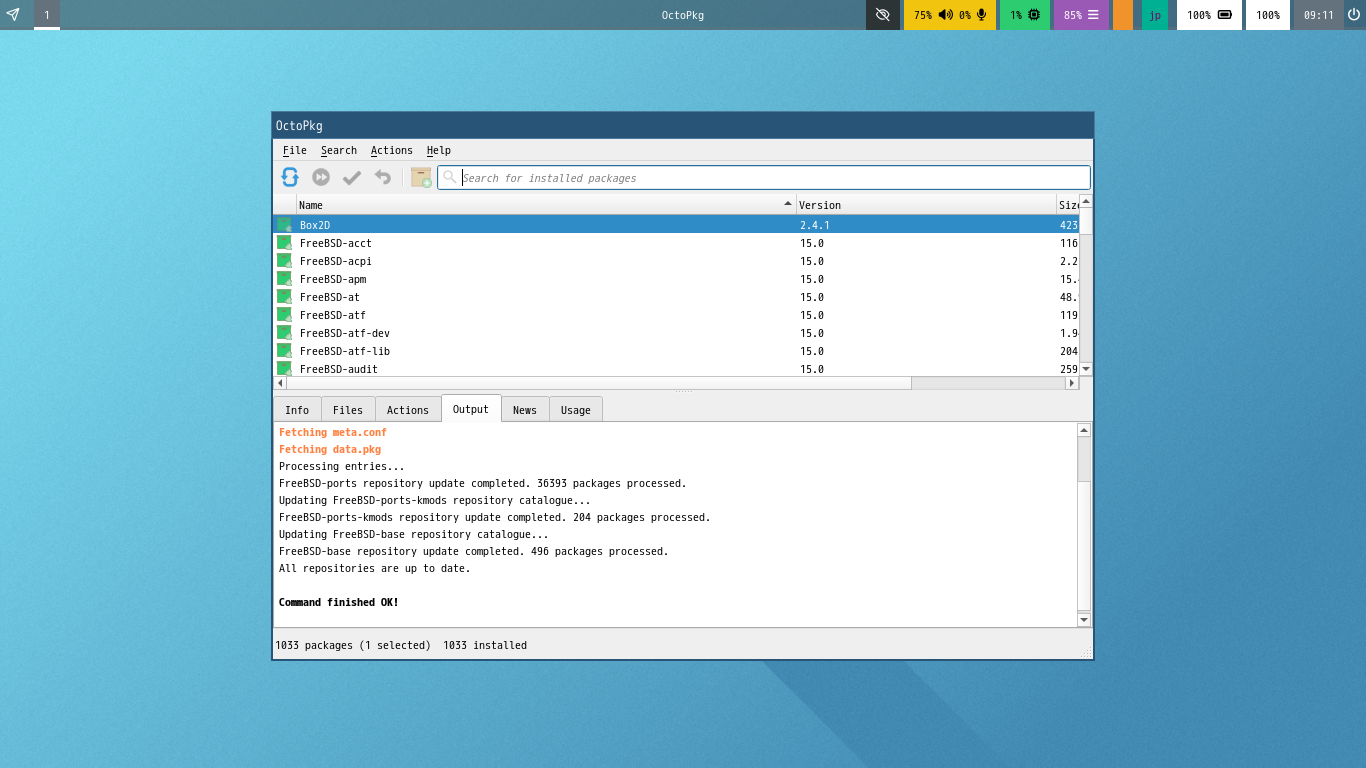 1. 概要 「OctoPkg」は、パッケージ管理(pkg)のグラフィカルフロントエンドです。 基本的な操作については共通事項の「パッケージ管理 OctoPkg」を参照してください。 2. インストール 「OctoPkg」自体は、コマンドでインストールします。 「root」ユーザ権限で。 pkg install -y octopkg 3. 起動 「スタート」→「システム」→「OctoPkg」