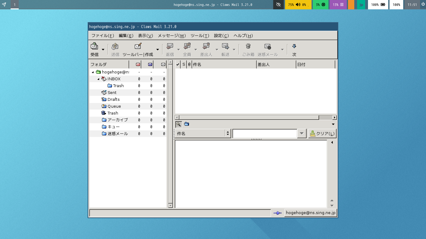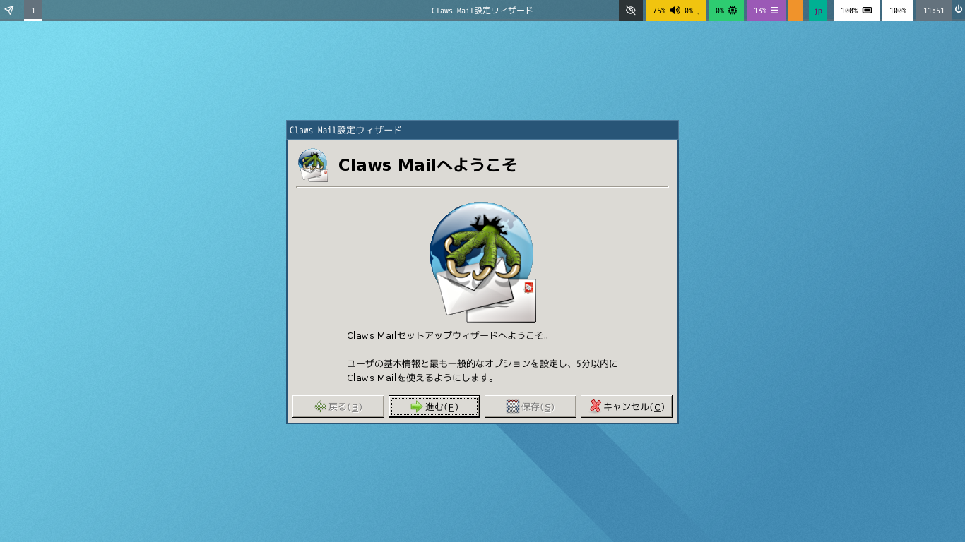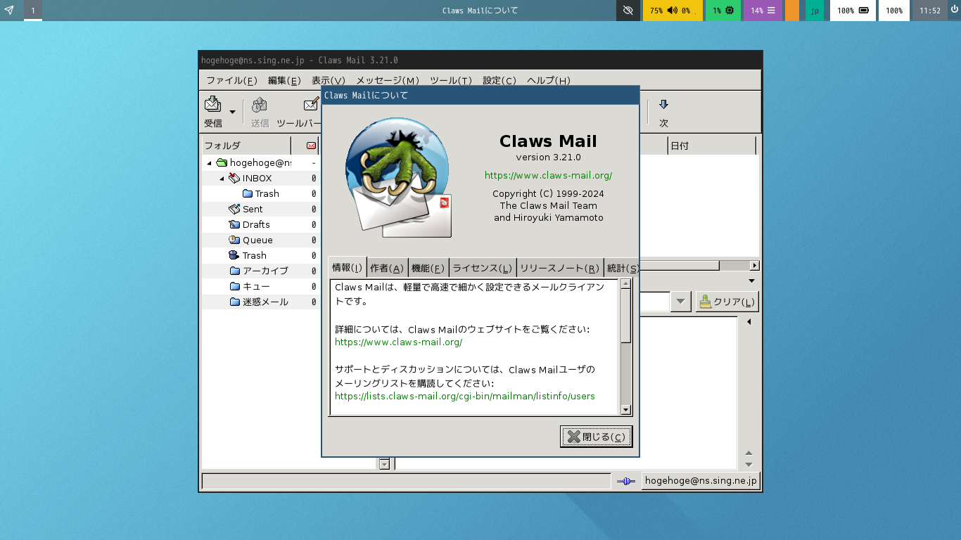 初回起動時は「設定ウィザード」から始まります。 起動直後の状態です。 2025年12月26日の時点で、下記のバージョンでした。 「設定ウィザード」他、操作方法については、「メールクライアント - Claws Mail」をご参照ください。 |