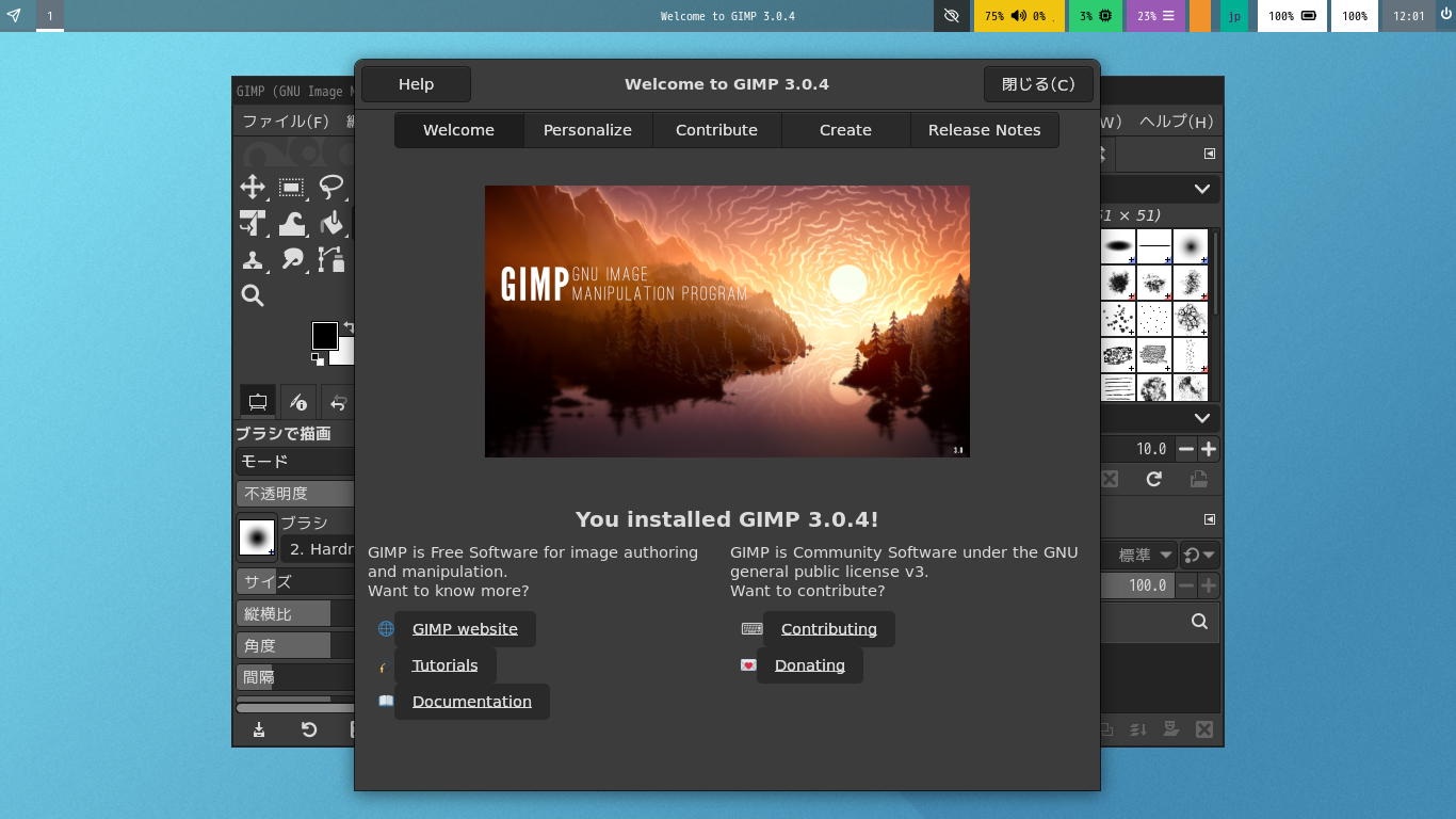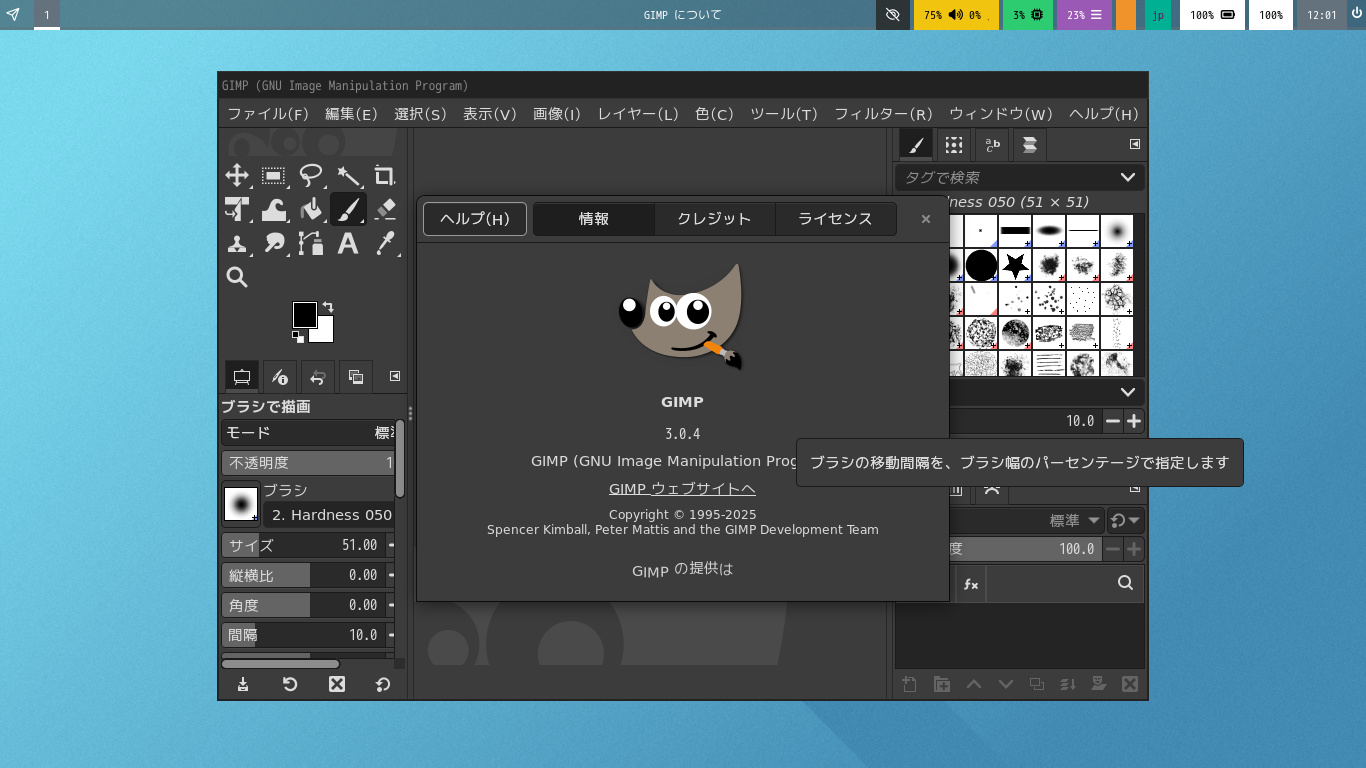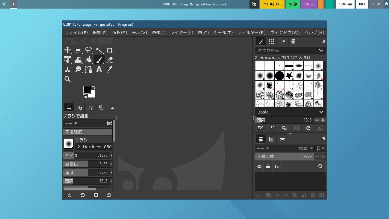 「閉じる」 起動直後の状態です。 2025年12月26日の時点で、下記のバージョンでした。 操作については、「画像編集ソフト - GIMP」に掲載しています。 上記は簡単なものですので、詳細なものがほしい方は、各所に初歩の手引きから応用編までありますので、そちらを参考にしてください。 |