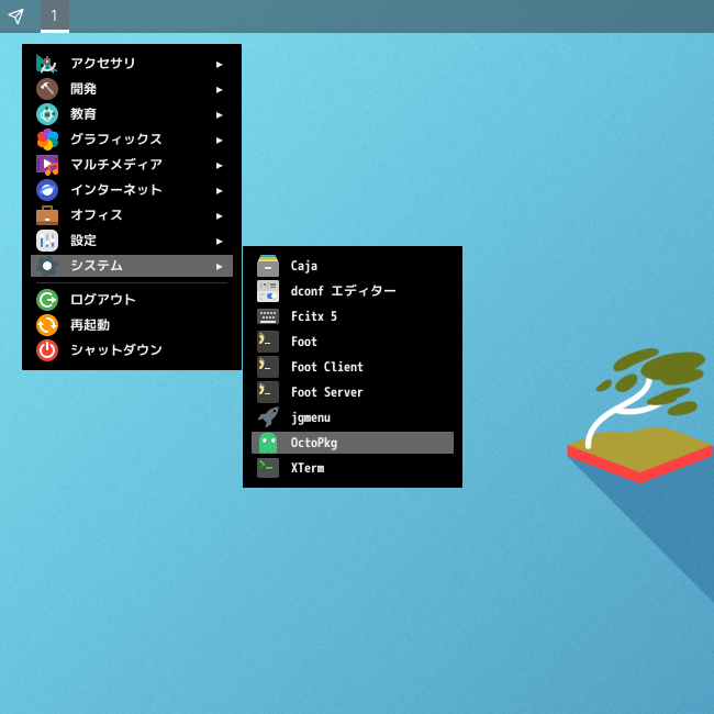 1. 概要 「OctoPkg」は、パッケージ管理(pkg)のグラフィカルフロントエンドです。 基本的な操作については共通事項の「パッケージ管理 OctoPkg」を参照してください。 2. インストール 「OctoPkg」自体は、コマンドでインストールします。 「root」ユーザ権限で。 pkg install -y octopkg 3. 起動 「スタート」→「システム」→「OctoPkg」