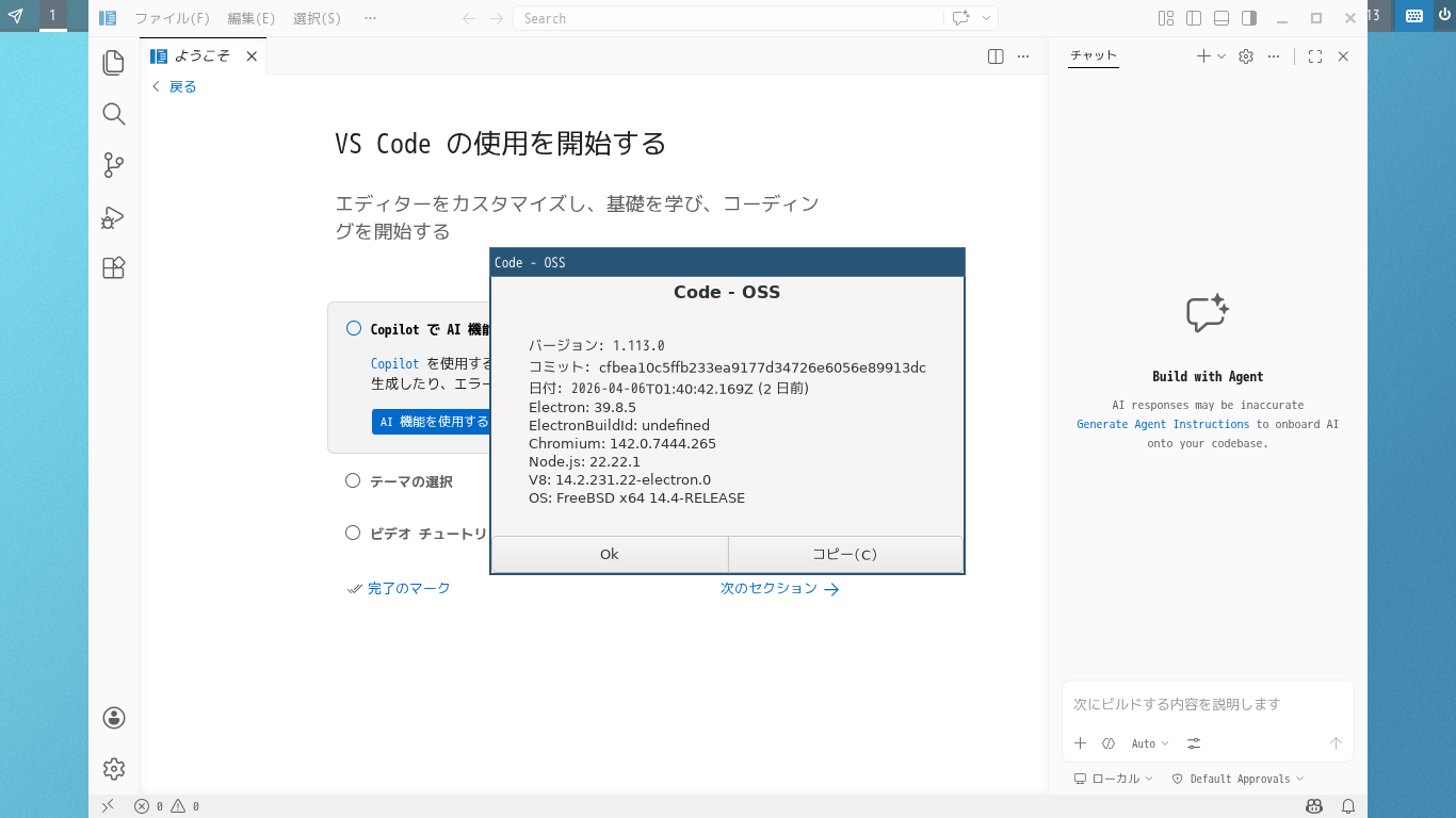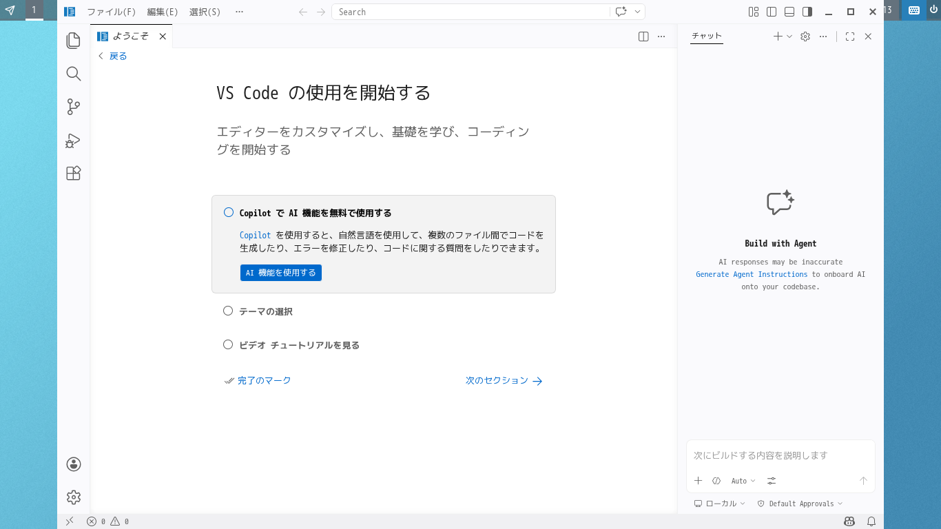 日本語化後、再起動直後の状態です。 (前回、日本語化に失敗していましたが、今回は成功しました) 2026年4月8日の時点で、下記のバージョンでした。 「Visual Studio Code」の操作等については「統合開発環境 Visual Studio Code」をご参照ください。 |