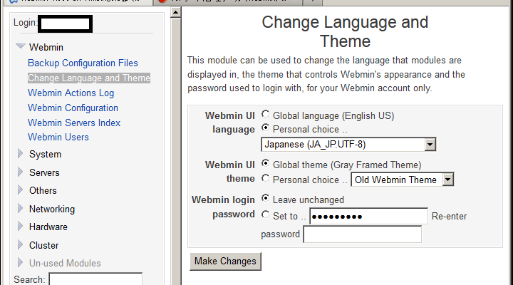 Webmin → Change Language and Theme → で「言語とテーマの変更画面」を表示します。