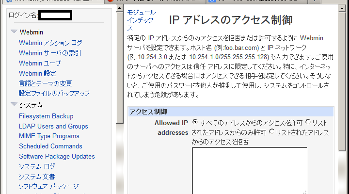 次に [Webmin] →「Webmin設定」→「IPアドレスのアクセス制御」で