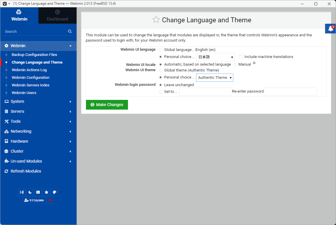 「Webmin UI theme」で「Personal choice」を選択して「Authenic Theme」を選択
