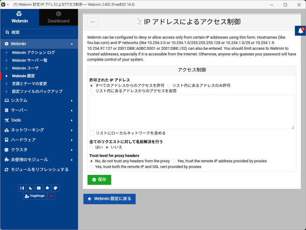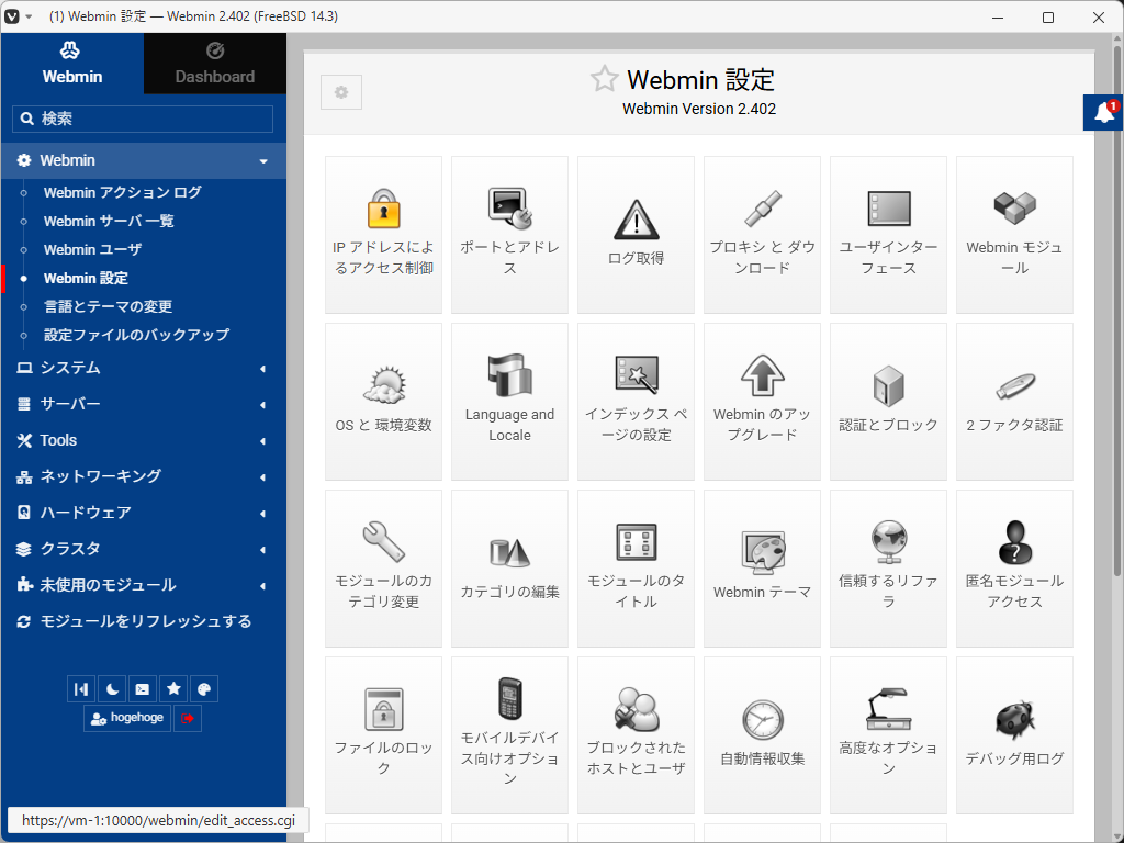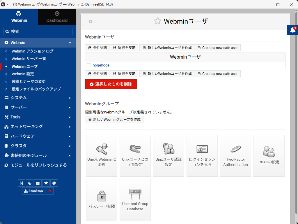 「Webmin」→「Webmin ユーザ」でユーザを追加・削除・変更したり、パスワードを変更したりできます。