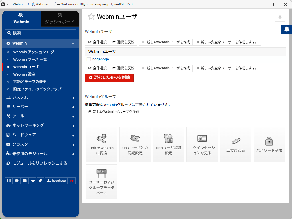 「Webmin」→「Webmin ユーザ」でユーザを追加・削除・変更したり、パスワードを変更したりできます。