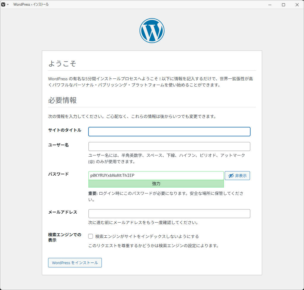 初回アクセス時に、「WordPress」の基本的な設定を行います。