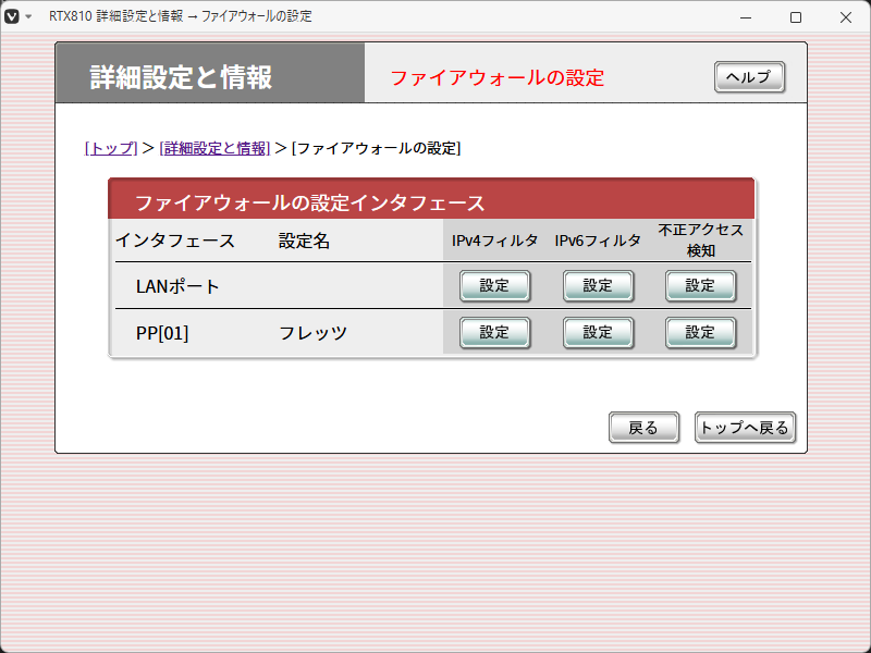 ポートをかける側(LAN/PP)、アドレス割当(IPv4/IPv6)のうち対象となるものの「設定」