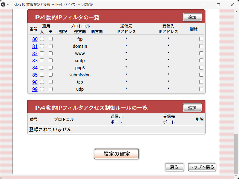 「適用 入/出」の欄で、何もチェックがはいっていないものは、定義しているだけで機能していません。