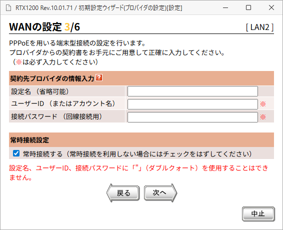 わたしの契約しているプロバイダは、アカウント名に記号がありまして、ここで設定できなかったため、結局、コマンドで入力することになりました。