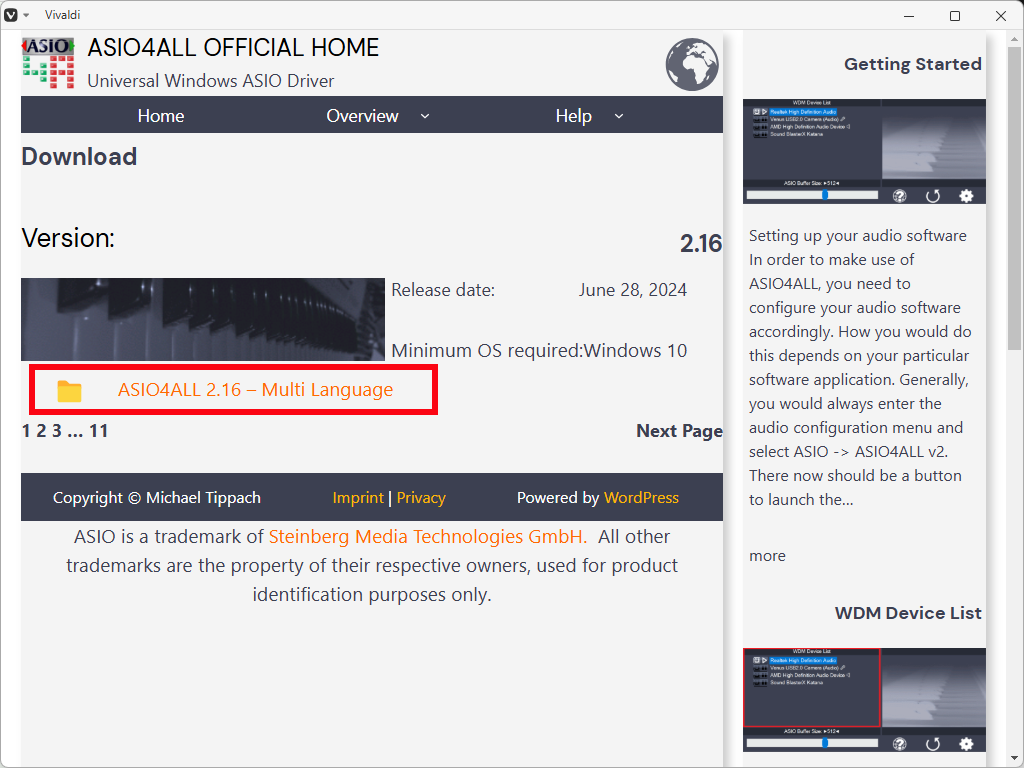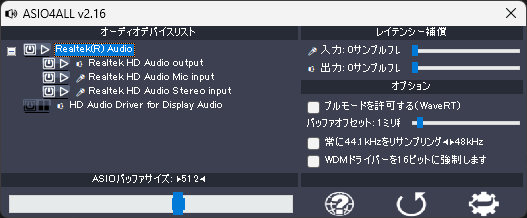 2025年1月29日時点の最新は、「ASIO4ALL 2.16」で、2024年6月28日にリリースされているようです。