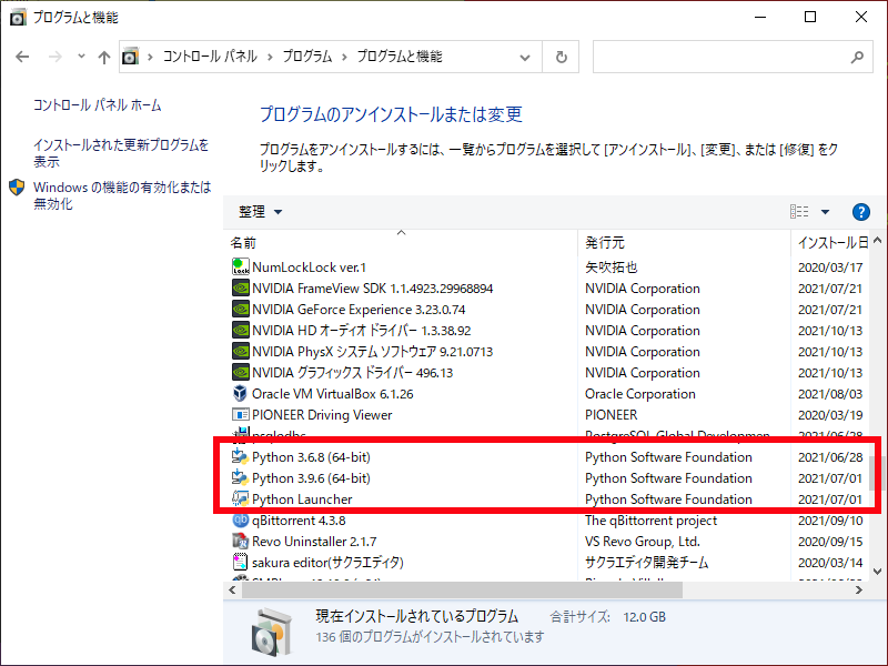 見にくいと思いますが、「python36」と「python39」とがあるでしょ。