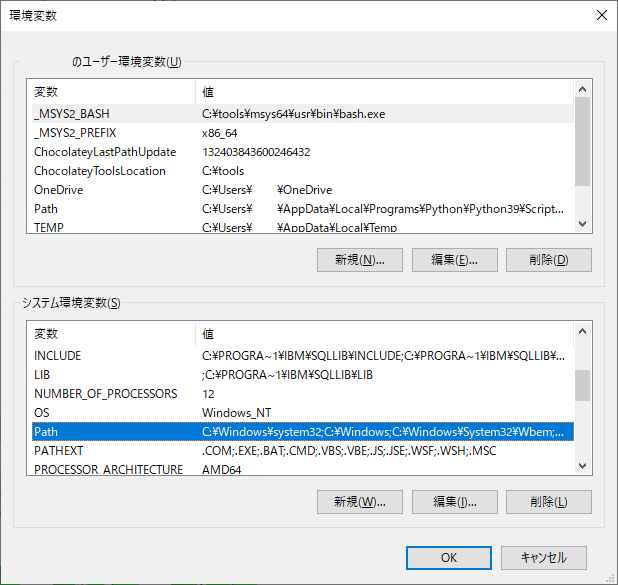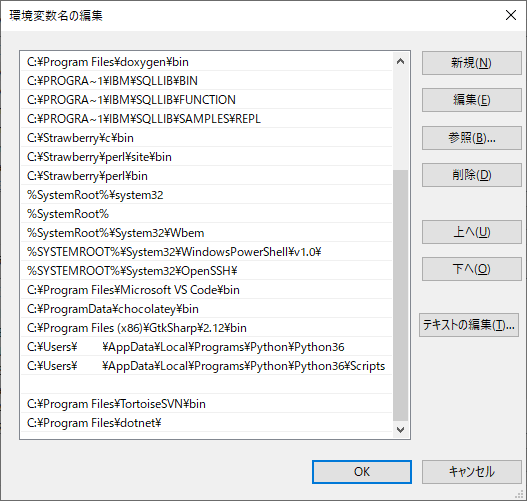 PATH=C:\Windows\system32;C:\Windows;C:\Windows\System32\Wbem;C:\Windows\System32\WindowsPowerShell\v1.0\;C:\Windows\System32\OpenSSH\;C:\Program Files (x86)\NVIDIA Corporation\PhysX\Common;C:\Program Files\NVIDIA Corporation\NVIDIA NvDLISR;C:\Program Files (x86)\Bitvise SSH Client;C:\Program Files\doxygen\bin;C:\PROGRA~1\IBM\SQLLIB\BIN;C:\PROGRA~1\IBM\SQLLIB\FUNCTION;C:\PROGRA~1\IBM\SQLLIB\SAMPLES\REPL;C:\Strawberry\c\bin;C:\Strawberry\perl\site\bin;C:\Strawberry\perl\bin;C:\WINDOWS\system32;C:\WINDOWS;C:\WINDOWS\System32\Wbem;C:\WINDOWS\System32\WindowsPowerShell\v1.0\;C:\WINDOWS\System32\OpenSSH\;C:\Program Files\Microsoft VS Code\bin;C:\ProgramData\chocolatey\bin;C:\Program Files (x86)\GtkSharp\2.12\bin;C:\Users\ユーザ名\AppData\Local\Programs\Python\Python36;C:\Users\ユーザ名\AppData\Local\Programs\Python\Python36\Scripts;C:\Program Files\TortoiseSVN\bin;C:\Program Files\dotnet\;C:\Users\ユーザ名\AppData\Local\Programs\Python\Python39\Scripts\;C:\Users\ユーザ名\AppData\Local\Programs\Python\Python39\;C:\Users\ユーザ名\AppData\Local\Microsoft\WindowsApps;C:\Users\ユーザ名\AppData\Roaming\cabal\bin;C:\ProgramData\chocolatey\lib\ghc\tools\ghc-8.10.1\bin;C:\tools\msys64;C:\Users\ユーザ名\.dotnet\tools