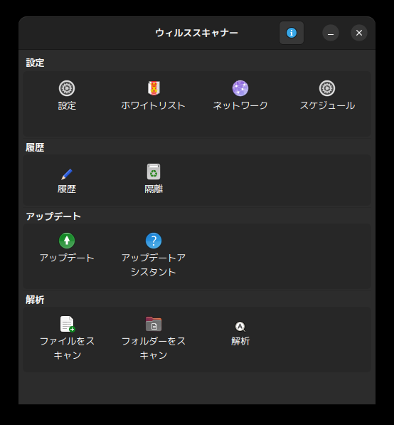 起動直後の状態です。 2023年4月24日の時点で、下記のバージョンでした。 操作方法については、「デスクトップ環境構築 - 共通事項 - ClamTk」をご参照ください。 |