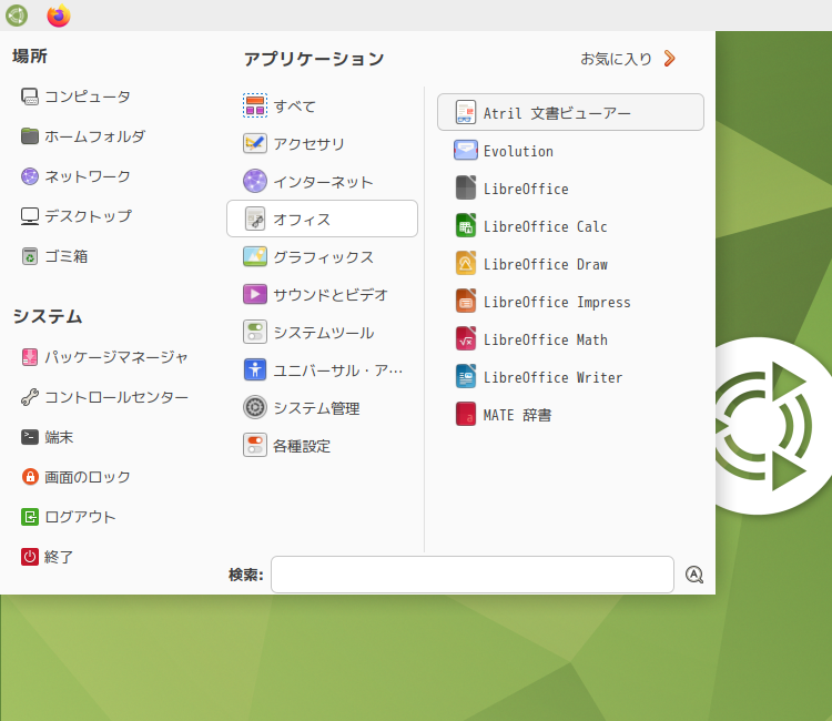 1. 概要 ドキュメントビューアとして、「Atril」を使用します。 「Atril」は、デフォルトでインストールされています。 2. 起動 「スタート」→「オフィス」→「Atril」